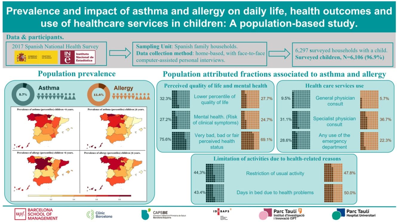 ConclusionThis population-based study of children reported the prevalence of asthma and allergies in Spain and provided complementary figures on geographic variability. The study shows that children with asthma and allergies had a worse perceived health status, quality of life, mental health, significant use of healthcare services, and restrictions in activities of daily living. This is a realistic illustration of the impact of asthma and allergies on children's lives, giving a new perspective to help physicians and public health authorities design new and effective policies.