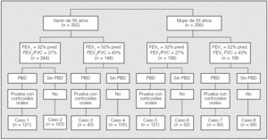 Fig. 1. Distribución de los casos del estudio. FEV1: volumen espiratorio forzado en el primer segundo; FVC: capacidad vital forzada; PBD: prueba broncodilatadora.