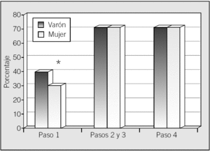 Fig. 2. Influencia del sexo del paciente en el diagnóstico de la enfermedad pulmonar obstructiva crónica (EPOC) antes y después de los resultados de las pruebas diagnósticas. Paso 1: diagnóstico de EPOC después de la presentación del caso clínico; pasos 2 y 3: después de los resultados de la espirometría y la prueba broncodilatadora; paso 4: después de los resultados de la prueba con corticoides orales. *p = 0,004.