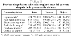 Los médicos participantes solicitaron una media (± desviación estándar) de 3,1 ± 1,1 pruebas diagnósticas por paciente, sin que se observaran diferencias significativas en función del sexo (3,2 ± 1,2 en varones frente a 3 ± 1,1 en mujeres; p = 0,72). La prueba más solicitada fue la espirometría, seguida por la radiografía de tórax. En función del sexo, la espirometría y las pruebas cutáneas fueron las pruebas más solicitadas en las mujeres, mientras que el electrocardiograma y la analítica de sangre fueron las más solicitadas en los pacientes varones (tabla III).