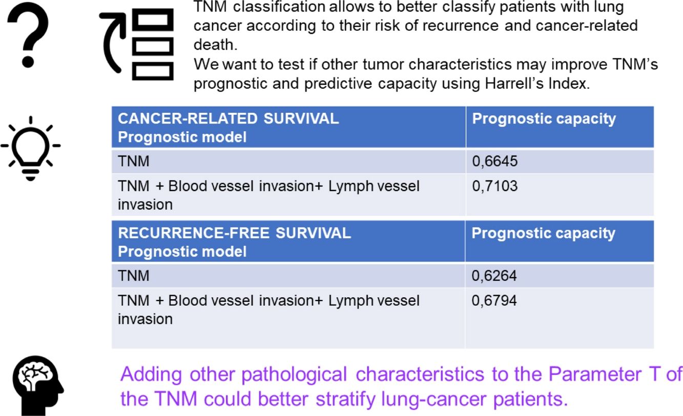 Expanding TNM staging system for lung cancer with the addition of new prognostic factors could enhance patient stratification and survival prediction. The goal of this study is to assess if TNM prognosis capacity could be improved by incorporating other pathological characteristics of surgical specimen.