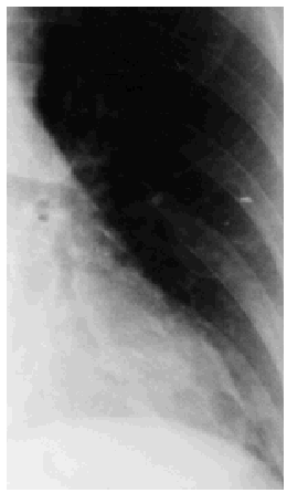Following diagnosis of iron-deficiency anemia a barium enema examination was carried out and the contrast medium was accidentally administered into the vagina, which tore at the side. The fluoroscopy showed venous intravasation of barium. The examination was discontinued and a chest x-ray revealed pulmonary barium embolization (Figure). The patient complained of dizziness and had signs of hypotension and shivering, followed by fever of 38ºC. The symptoms abated after administration of intravenous antibiotics and the vaginal tear was repaired surgically. The results of analysis at this time were prothrombin time 100%; activated partial thromboplastin time 30/30 s; fibrinogen, 2.56 g/L; positive for fibrinogen degradation products (80 µg/mL); platelets, 149x109/L. Tests for barium in the blood and urine were negative.