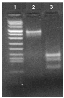 Figure. Profile of bands obtained by polymerase chain reaction/restriction fragment length polymorphism of gene hsp65 using Msp1 and Hinf1 restriction enzymes. Lane 1: molecular weight marker VIII (Roche); lane 2: restriction fragment using Hinf1 enzyme; lane 3: restriction fragment using Msp1 enzyme.