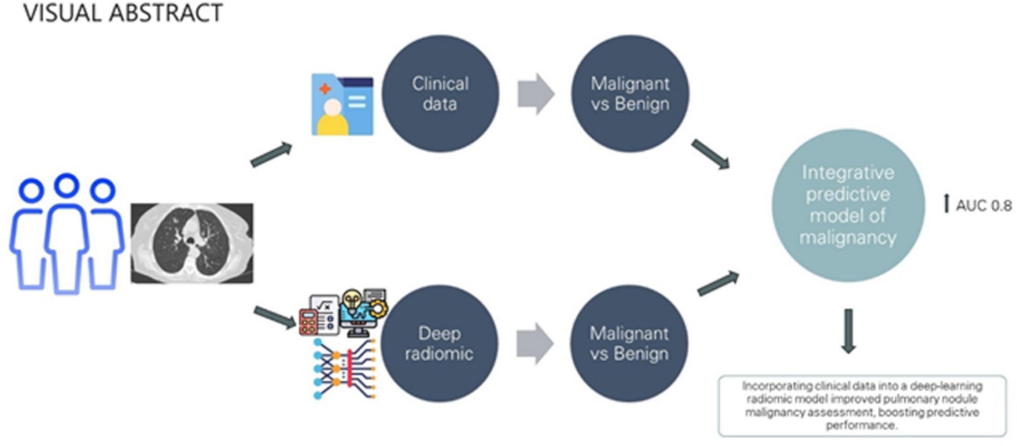 DiscussionRadiomics has revolutionised medical imaging, and there are currently many working groups dedicated to this research in different fields.18,31 Other AI techniques, such as deep learning, allow us to associate these radiomic characteristics with other data, such as clinical information. Regarding this integrative approach, few working groups are dedicated to LC and PN diagnosis using radiomics and clinical data together, and the retrospective study by Lui et al.32 stands out. They conducted an analysis utilising 20 radiomic features, in addition to age, gender, and PN location. Successfully, they developed a predictive model that achieved an AUC of 0.81 (95% CI: 0.75–0.87). Similar results were published in 2023 by Lin et al.33 With a similar approach, our study yields promising results, as the integration of selected clinical features with radiomic image data based on deep learning techniques can formulate a predictive model that significantly improve results compared to relying solely on image analysis, achieving a positive predictive value of 94% (95% CI: 0.85–0.99) and an AUC of 0.80 (95% CI: 0.67–0.92). It is worth noting that the accuracy showed a slight but non-significant decrease in the integrative model, which could be related to the imbalance in the number of benign and malignant cases in our cohort.