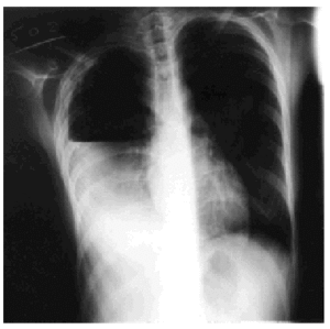 Treatment with rifampicin, isoniazid, and pyrazinamide was commenced upon admission, and sensitivity to all of them was later confirmed. Forty-eight hours after admission, the patient's cough suddenly worsened and increased shortness of breath developed with intense pleuritic pain on the right side. Radiological examination revealed a subtotal pneumothorax of the right lung. A drainage tube was inserted and a yellowish, translucent fluid was removed and found to contain 17.20 leukocytes (80% segmented, 12% with polymorphic nuclei, 0% eosinophils, 8% lymphocytes, and 0% monocytes), and a red blood cell count of 0.01x106/µL. Blood tests revealed pH to be 7.19, glucose 56 mg/dL, total proteins 4.1 g/dL, cholesterol 48 mg/dL, lactate dehydrogenase 9573 U/L, amylase 47 U/L, and adenosine deaminase 82 U/L. A culture of the pleural fluid was positive for M tuberculosis. The chest pain remitted, the pneumothorax resolved, and the drainage tube was removed after 15 days. Fever occasionally as high as 39.5 ºC persisted. Forty-eight hours later the chest pain reappeared and coughing became more frequent, with no increase in expectoration. The x-ray showed a recurrence of pneumothorax, pleural effusion, and right pleural thickening (Figure). A thoracic drainage tube was inserted again and a thick, purulent fluid was removed. Tuberculous aggregates were identified in the Ziehl stain and no concurrent infections were found. A computed tomography (CT) scan of the thorax confirmed the pneumothorax, the loculated pleural effusion, and the pleural thickening. Because of the pleural thickening, the persistence of fever and of empyema, thoracic surgery was considered necessary. A pleural decortication was performed. Visceral and parietal pleural thickening, a posterior empyematic chamber, and a cavity in segment 6 open to the pleural space were detected during the procedure. A few days later the patient was asymptomatic with mild residual pleural thickening and was negative for M tuberculosis within a few weeks.