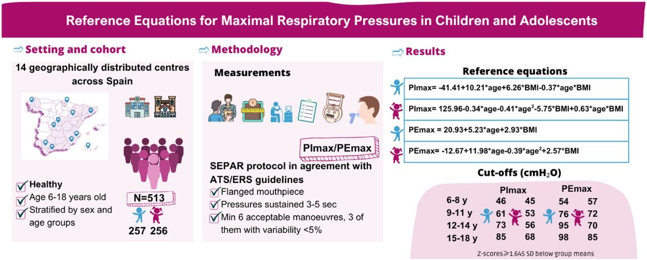 ConclusionsThis study presents novel reference equations for maximal respiratory pressures in the healthy Spanish paediatric population, derived from the largest paediatric sample in Europe and developed in accordance with international guidelines. For the first time in Spain, cut-off points for defining respiratory muscle weakness in children and adolescents have been established. These reference values will enhance the assessment, diagnosis, and monitoring of respiratory muscle dysfunction in diverse clinical conditions.
