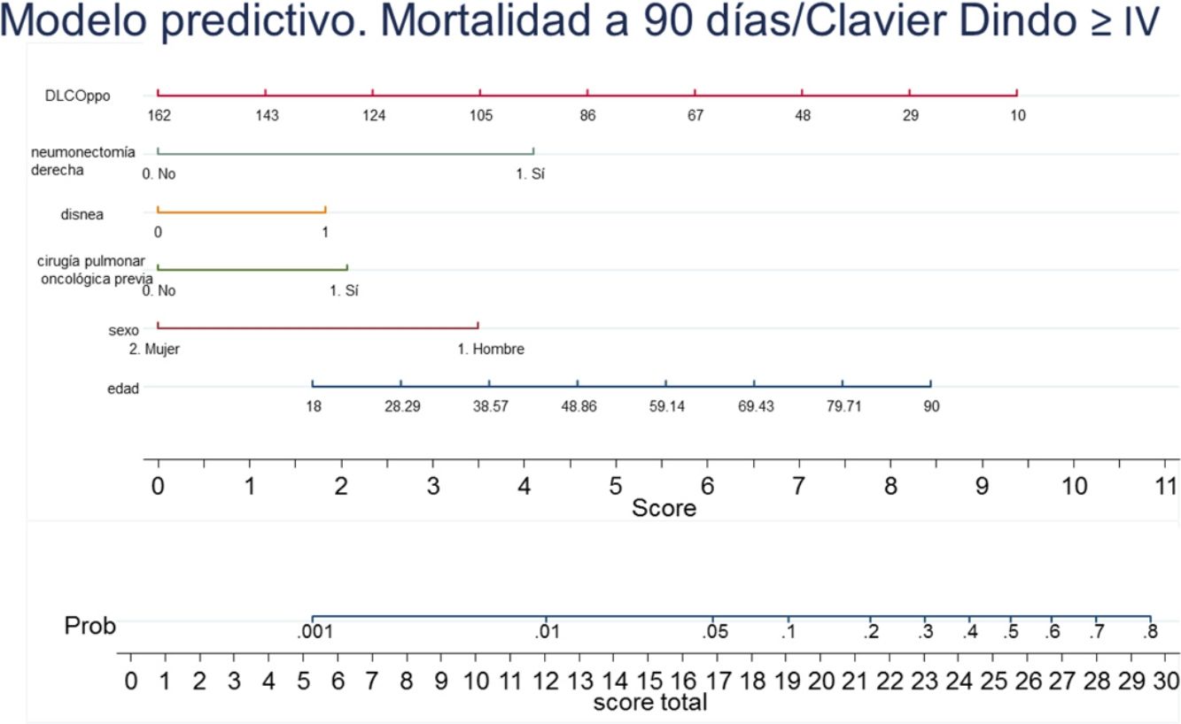 Con los resultados del análisis de regresión logística final se elaboró un nomograma, en el que se muestra gráficamente el peso que tiene cada variable. Sumando los puntos correspondientes a cada una de las variables del modelo final se obtiene una puntuación total, y con ella, una probabilidad predicha de sufrir el evento muerte o complicación Clavien Dindo≥IV a 90 días (fig. 3). Por ejemplo, un paciente varón (3,5 puntos) de 78 años (7 puntos) con disnea de moderados esfuerzos (2 puntos), sometido a una resección pulmonar por un adenocarcinoma previamente (2 puntos), que tiene una DLCOppo del 50% (6,5 puntos), al que se le plantea una resección anatómica, obtiene un valor total de 22, lo que corresponde un riesgo a 90 días de mortalidad postoperatoria o complicaciones importantes de en torno al 20%. El mismo paciente con una DLCO del 100% reduce su riesgo al 10%, y si además se trata de la primera resección pulmonar al 5%.