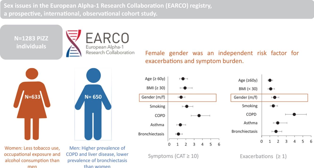 Gender plays a role in many aspects of chronic obstructive pulmonary disease (COPD).1,2 Sex and gender in COPD reflect a complex interplay between genuine biological differences and sociocultural influences.2 In addition to possible biological aspects such as airway diameter or the complex effects of sex hormones on respiratory disease,3 socio-cultural factors also play an important role. Alpha-1-antitrypsin deficiency (AATD) is a genetic condition that predisposes to the early development of COPD4 and liver disease.5 Many of the issues related to sex and gender in COPD are plausibly important in AATD. For example, occupational exposures and certain risk behaviours, such as tobacco and alcohol consumption, for which gender differences still exist, have a significant impact on the development of AATD, lung and liver disease.6,7 The pattern of comorbidities differs significantly between men and women, but at the same time comorbidities play an important role in COPD and influence many of the symptoms that make up the individual burden of our patients.8 They also have a significant impact on the prognosis of the disease, and regardless of their prevalence, certain comorbidities are associated with different prognoses in men and women.9,10 To address the complexity of the relationship between gender and a genetic predisposition such as AATD, it is also important to recognise that men and women perceive disease differently, express symptoms differently and use health services in a different way.11 Due to the small number of cases in different countries and centres, it is especially difficult to study gender-specific aspects of rare diseases, and it is not surprising that there are no meaningful data on this topic in AATD.12 The prospective international registry of the European Alpha-1 Research Collaboration (EARCO) for patients with AATD offers the opportunity for the first time to investigate such questions in a large international, well-characterised cohort. The aim of the current study was to investigate sex-specific aspects of AATD in relation to lung and liver disease, symptom burden and exacerbations in the registry.