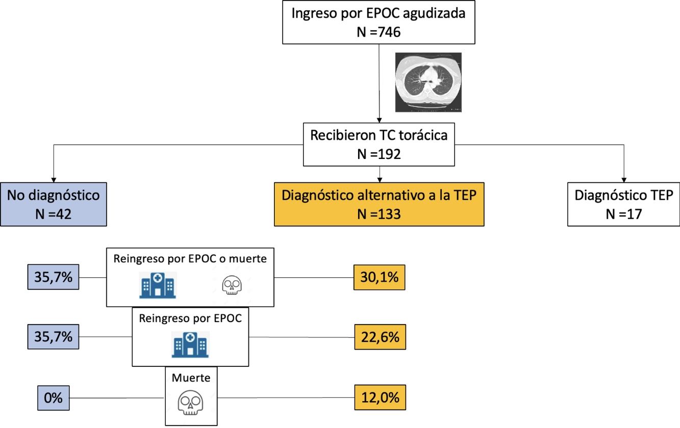 ConclusionesEntre los pacientes que requieren ingreso por agudización de EPOC, la TC ofrece un diagnóstico alternativo a la TEP en el 76% de las ocasiones. El tratamiento específico de estas patologías no se asocia a un mejor pronóstico durante el seguimiento.