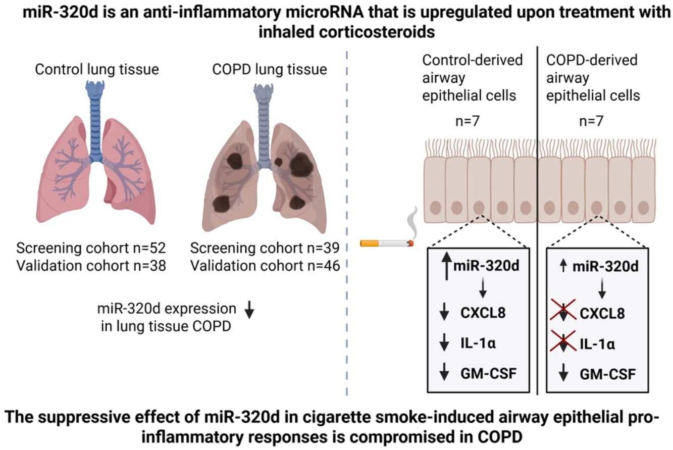 ConclusionsmiR-320d's suppressive effect on bronchial epithelial pro-inflammatory responses cells may be compromised in COPD. Additionally, miR-320d expression in lung tissue was lower with COPD severity. Thus, lower miR-320d anti-inflammatory action may contribute to persisting inflammation in COPD.