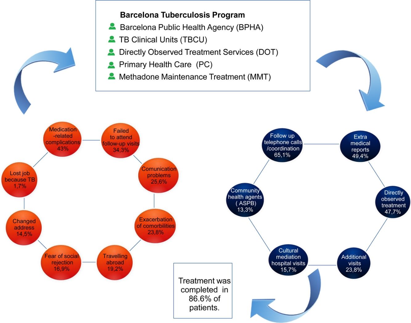 Numerous strategies have been reported in the literature to enhance treatment adherence and contact tracing, including reminders and food vouchers, adherence agreements, intensive patient supervision and social support, the use of new technologies such as an ingestible sensor-based system, video-calls, video DOT etc., which seem to have some potential.34,35 However, broad consensus in the literature is reserved for multi-pronged approaches known as “intervention packages”. This approach is based on patients’ needs and is effective in enhancing adherence.5,36–41 The combined use of all the strategies employed in this study—follow-up calls and liaison between healthcare levels, medical and humanitarian reports, DOT, extra visits, cultural mediation and CHW—allowed completion of most anti-TB treatments and contact tracing. The work performed in a network consisting of healthcare and non-healthcare professionals was essential to carry out these activities. Among other elements, key factors configuring the strategy implemented by the Barcelona TB Program are TB units with nurse case managers, public health teams, DOT teams, CHW, primary care and methadone maintenance programs.7,42,43 As in other countries such as the United Kingdom, the cornerstones of this strategy are flexible healthcare, multidisciplinary teams, and the assignment of a health professional as a key worker to each patient with TB.44