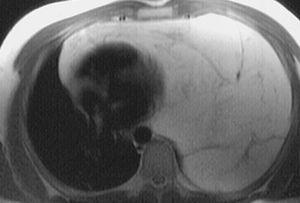La tomografía computarizada puso de manifiesto una masa de 20 x 21 x 18 cm, que ocupaba la totalidad del hemitórax izquierdo, desplazaba el mediastino hacia el lado contralateral y colapsaba el pulmón hacia la zona más superior de este hemitórax. No se observaban signos de infiltración en las estructuras vecinas. En la resonancia magnética la tumoración brillaba en secuencias ponderadas en T1, era isointensa con la grasa y anulaba su señal en secuencias de saturación grasa (fig. 1).