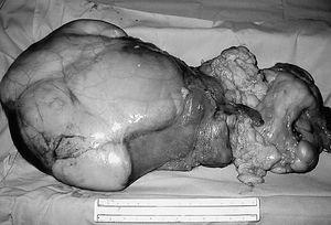 El peso, según la bibliografía revisada7, oscila entre 154 y 6.000 g; en nuestro caso la tumoración superaba los 3.000 g de peso, con unas dimensiones de 30 x 25 x 9 cm.