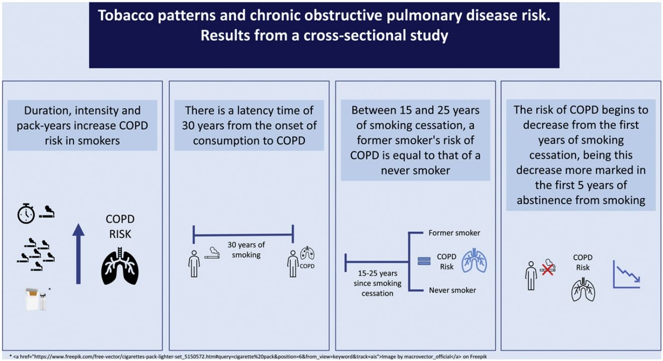 In conclusion, the COPD risk increases with duration, intensity and lifetime tobacco consumption and decreases with years of abstinence. It seems to be confirmed that there is an induction period of about 30 years for the onset of COPD after smoking initiation. The COPD risk increases rapidly after the first cigarette is smoked. In smokers, smoking cessation continues to be one of the most important aspects in reducing the COPD risk incidence, since after 15–25 years of abstinence from smoking it seems that the risk could be equal to that of a never smoker.