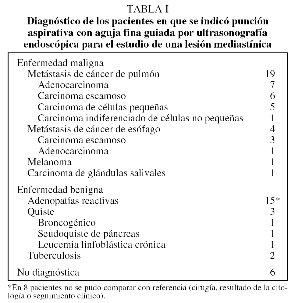 En conclusión, la USE-PAAF es una técnica eficaz y segura en el estudio de las afecciones mediastínicas y permite el diagnóstico citológico de adenopatías no valorables por la TAC por su pequeño tamaño. La probabilidad de malignidad es mayor cuanto mayor es el tamaño de la lesión a estudio.