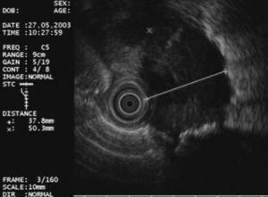La ultrasonografía endoscópica (USE) es una técnica que combina la endoscopia digestiva y la ecografía para conseguir imágenes ecográficas desde el interior del tubo digestivo. Cuando el transductor se encuentra en el interior del esófago, pueden visualizarse las estructuras del mediastino medio y posterior situadas en un radio de 6 cm alrededor del esófago. La punción aspirativa con aguja fina guiada por USE en tiempo real (USE-PAAF) ha demostrado recientemente ser una técnica muy segura y muy eficaz en el diagnóstico de extensión mediastínico del CPCNP y del carcinoma de esófago3-6. Además, en los últimos años se han publicado algunas series sobre su utilidad en el diagnóstico de masas mediastínicas7-9.