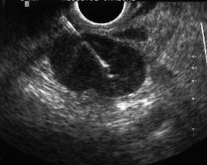 La USE-PAAF se realizó con un ecoendoscopio sectorial (GF UC30P, Olympus America Inc., Melville, NY, EE UU) y una aguja de Wilson Cook de 22 G y 8 cm de longitud (Wilson-Cook Medical Inc., Winston-Salem, NC, EE UU), según la técnica habitual: después de localizar la lesión a estudio con el ecoendoscopio sectorial, se introdujo la aguja a través del canal operativo del ecoendoscopio haciéndola avanzar hasta el interior de la lesión bajo control ultrasonográfico en tiempo real (fig. 3). El uso sistemático de Doppler color permitió descartar la existencia de vasos sanguíneos en el trayecto de la aguja. Tras retirar el estilete central de la aguja (que evita que la muestra obtenida en la punción se contamine con células de la pared del tubo digestivo), se aplicó una presión negativa entre 3 y 5 ml mediante una jeringa de 10 ml acoplada a la empuñadura de la aguja, mientras el ecoendoscopista realizaba movimientos repetidos de avance y retirada de la aguja dentro de la lesión.