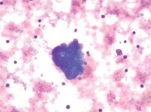 Durante la realización de la USE-PAAF, un citólogo se hallaba presente en la sala de exploración para valorar de forma inmediata la muestra obtenida. Parte de ésta se extendió sobre una laminilla y se tiñó con una tinción rápida (Diff-Quick®, Diagnostic Grifols S.A., España), mientras que el resto del material se conservó en alcohol para su posterior tinción con Papanicolau y en solución salina para procesarla en forma de bloque celular (fig. 4). Se consideró que una lesión era neoplásica cuando se identificaron células malignas, mientras que la ausencia de células malignas junto con la presencia de linfocitos normales se consideró diagnóstica de adenopatía benigna. Para el diagnóstico de tuberculosis se estimó necesaria la identificación de granulomas caseificantes y/o cultivo de Löwenstein positivo. Para el análisis estadístico se consideró positivo cualquier resultado diferente de adenopatía benigna.