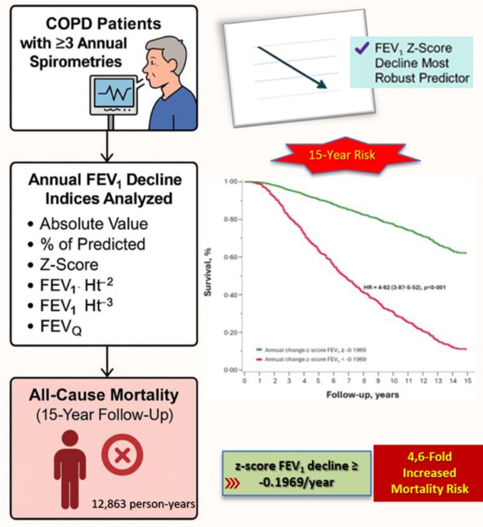 ConclusionThe annual decline in FEV1z-score is the most robust FEV1 expression predictor of long-term mortality in COPD. These findings suggest that incorporating longitudinal z-score assessments into clinical practice may improve risk stratification and patient management.